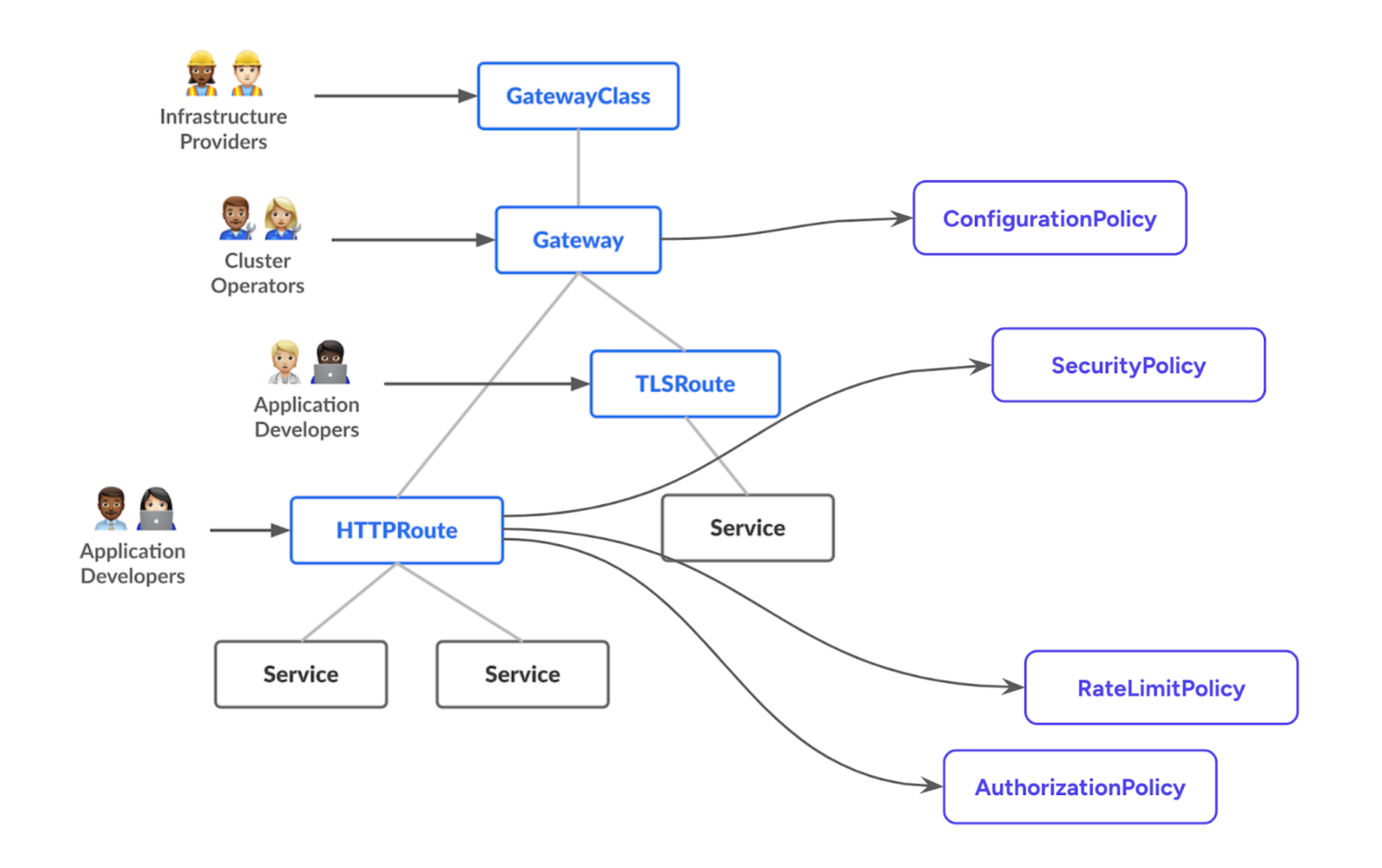Policywhen naming the CRD. For example, the Gateway API defines a BackendTLSPolicy, which allows us to quickly infer that this resource is designed to configure aspects of TLS communication for the connection between a gateway and a backend workload. -
