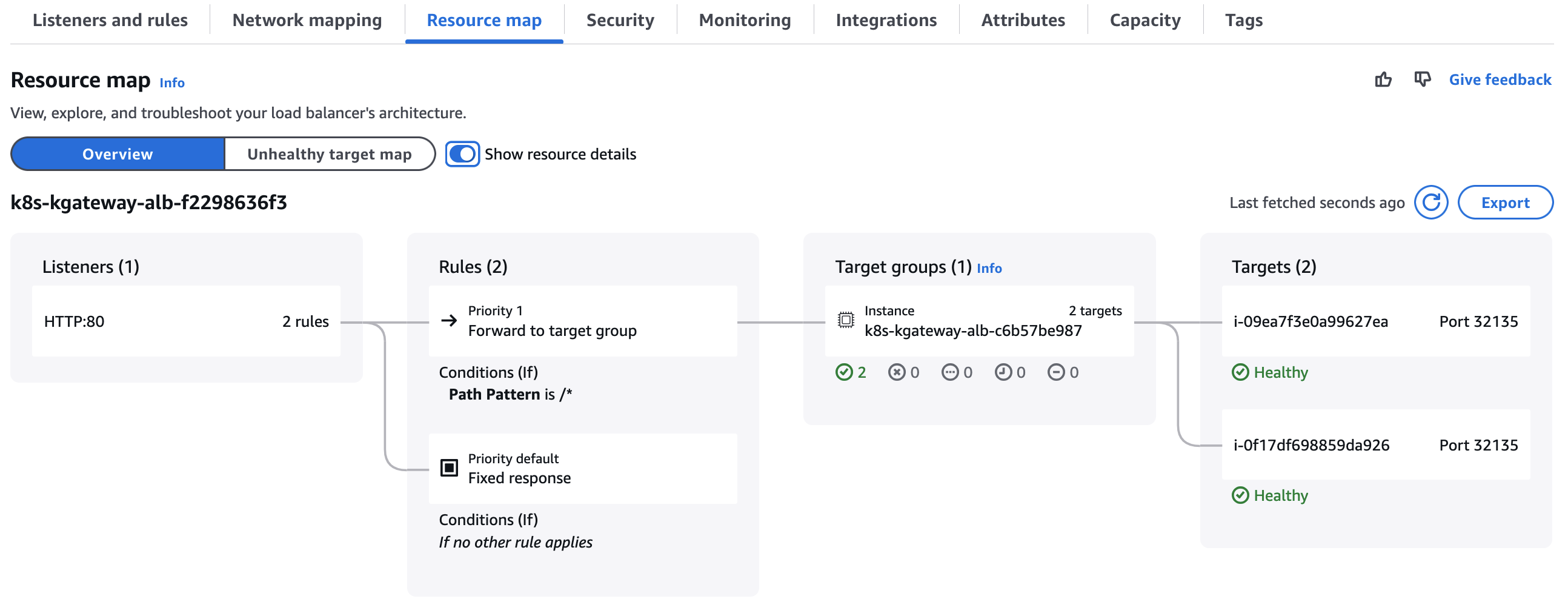 k8s-kgateway-alb-<hash>. Note that it might take a few minutes for the ALB to provision. - On the Resource map tab, verify that the load balancer points to healthy EC2 targets in your cluster. For example, you can click on the target EC2 name to verify that the instance summary lists your cluster name.